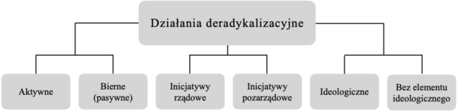 Programy deradykalizacyjne można dzielić ze względu na różne czynniki, m.in. podmiot realizujący (inicjatywy rządowe i pozarządowe), uwzględnienie elementu ideologicznego (czy program zakłada, że powodem zradykalizowania się danej jednostki była jakaś ideologia – najczęściej religijna – i zawiera rozwiązania nakierowane na zmianę poglądów/postaw związanych z taką ideologią) czy też sposób przystąpienia do takiego programu (działania aktywne: podmiot realizujący program sam szuka/wybiera uczestników; działanie pasywne: potencjalni uczestnicy sami poszukują/zgłaszają się do programu). Poniżej znajduje się typologia programów deradykalizacyjnych według Daniela Koehlera (rysunek) z opisem na czym skupia się dany program i jakie treści lub podejścia w nim dominują: