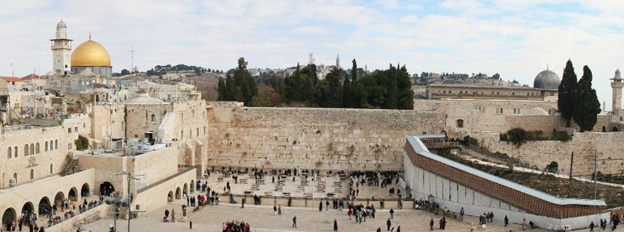 Panoráma Múru nárekov s Kupolou na skale (vľavo) v pozadí a mešitou al-Aksá (vpravo). Zdroj: Wikimedia Commons.